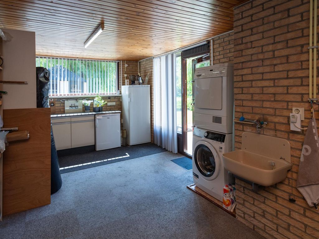 Entree met meterkast en toegang tot een toiletruimte met fonteintje en trapopgang naar de eerste verdieping. Ruime L-vormige living met een natuurstenen vloer en vloerverwarming, convectorput, twee schuifpuien naar de tuin, plafond met inbouwspots en veel lichtinval door de grote raampartijen. Open keuken met moderne witte hoogglans hoekopstelling voorzien van een composiet blad en inbouwapparatuur waaronder een keramische kookplaat, afzuigkap, koelkast, vaatwasser, oven en magnetron. Vanuit de hal is er verder toegang tot de inpandige ruime garage/annex berging met extra keukenblok, opstelplaats voor de wasmachine, uitstort gootsteen, elektrisch bedienbare garagedeur naar de oprit en deur naar de achtertuin. Heerlijk ruime, zonnige en ‘groene’ achtertuin pal op het Zuiden met een blokhut, gelegen aan een sloot (met een trapje) en een heerlijk uitzicht op het Oosterpark! De begane grond is voor- en achter voorzien van HR++ beglazing (m.u.v. de schuifpui).