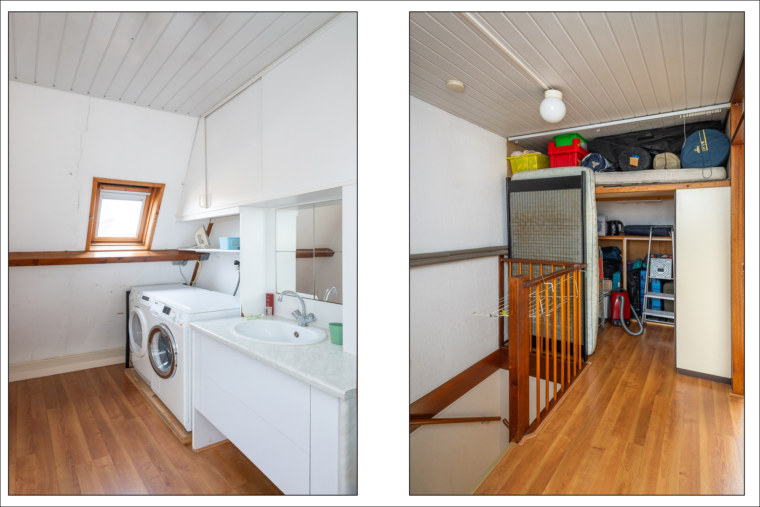 Overloop met wastafel met wastafelmeubel, wasmachine-aansluiting, opstelling CV-combiketel en een dakraam. Toegang tot een 4e en 5e slaapkamer, beiden met een dakraam.