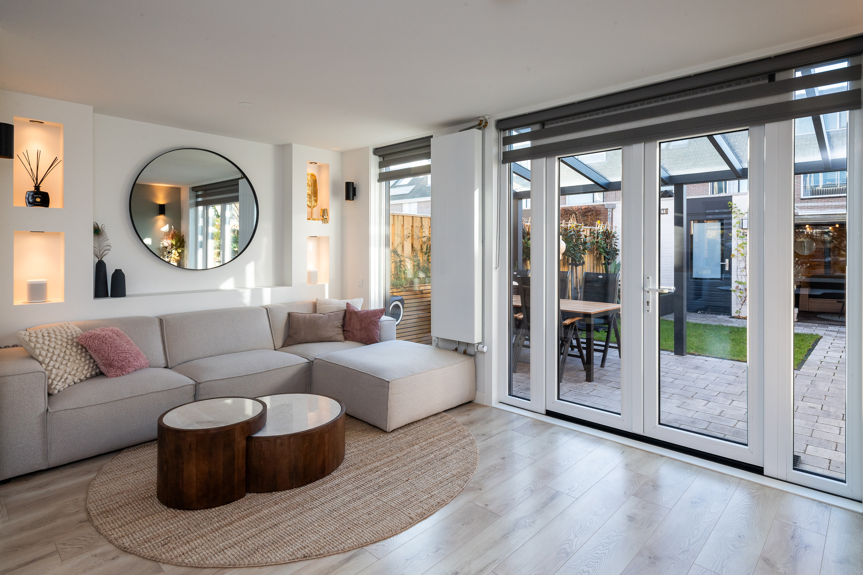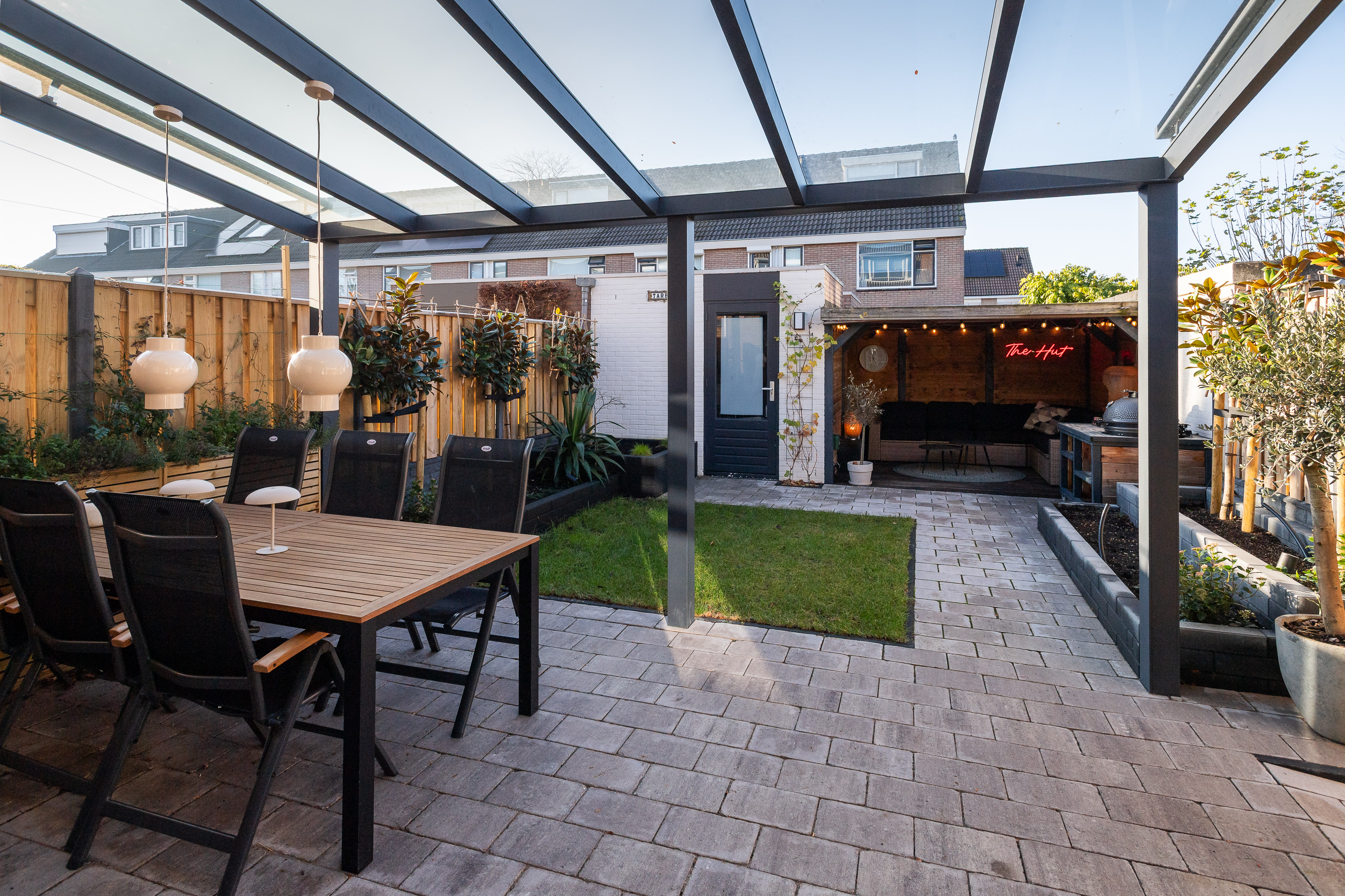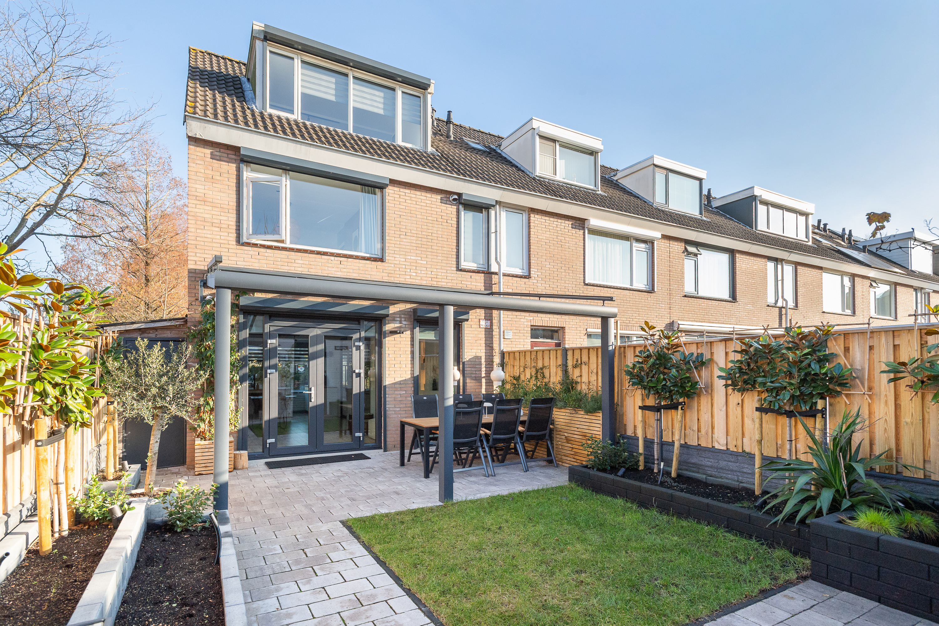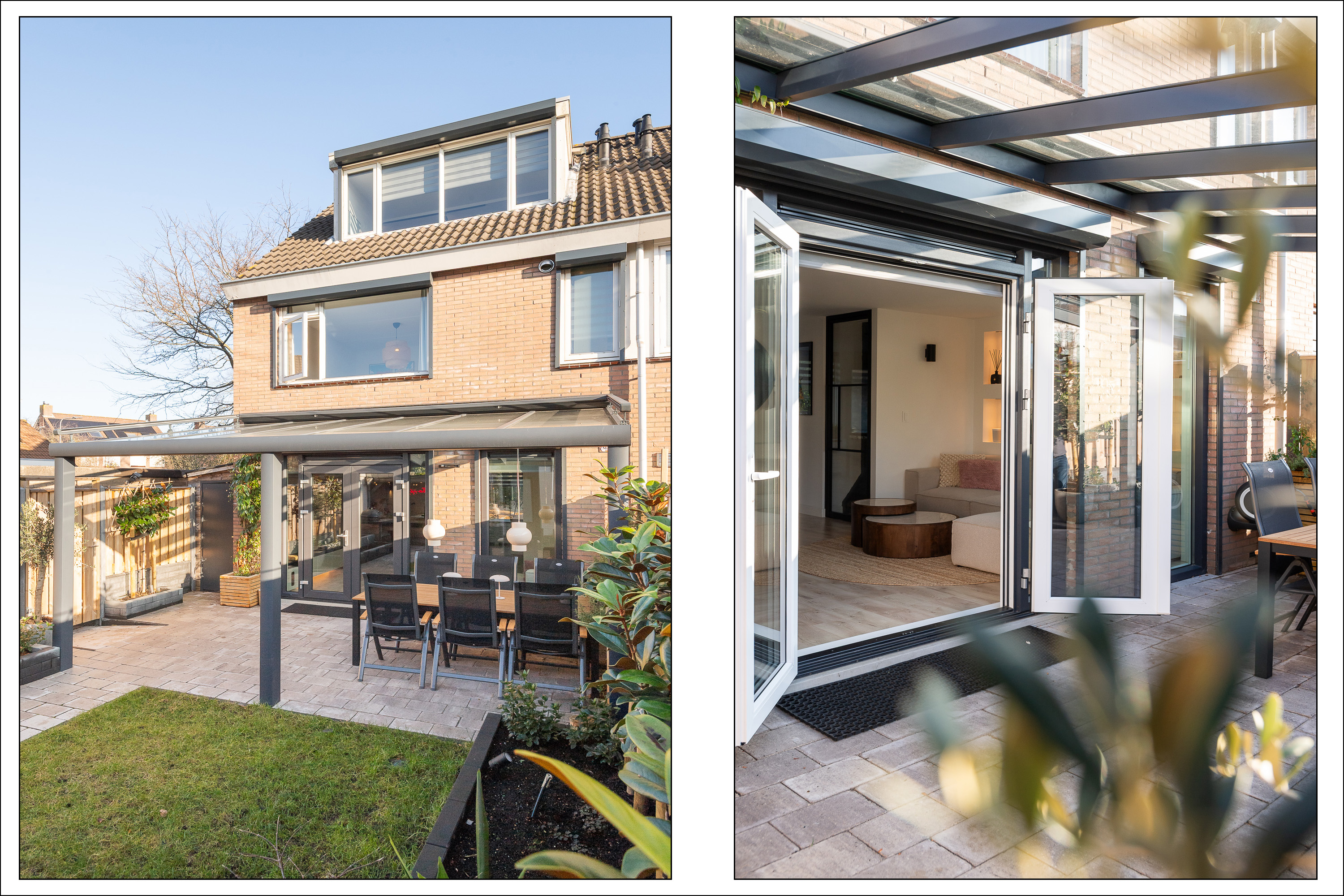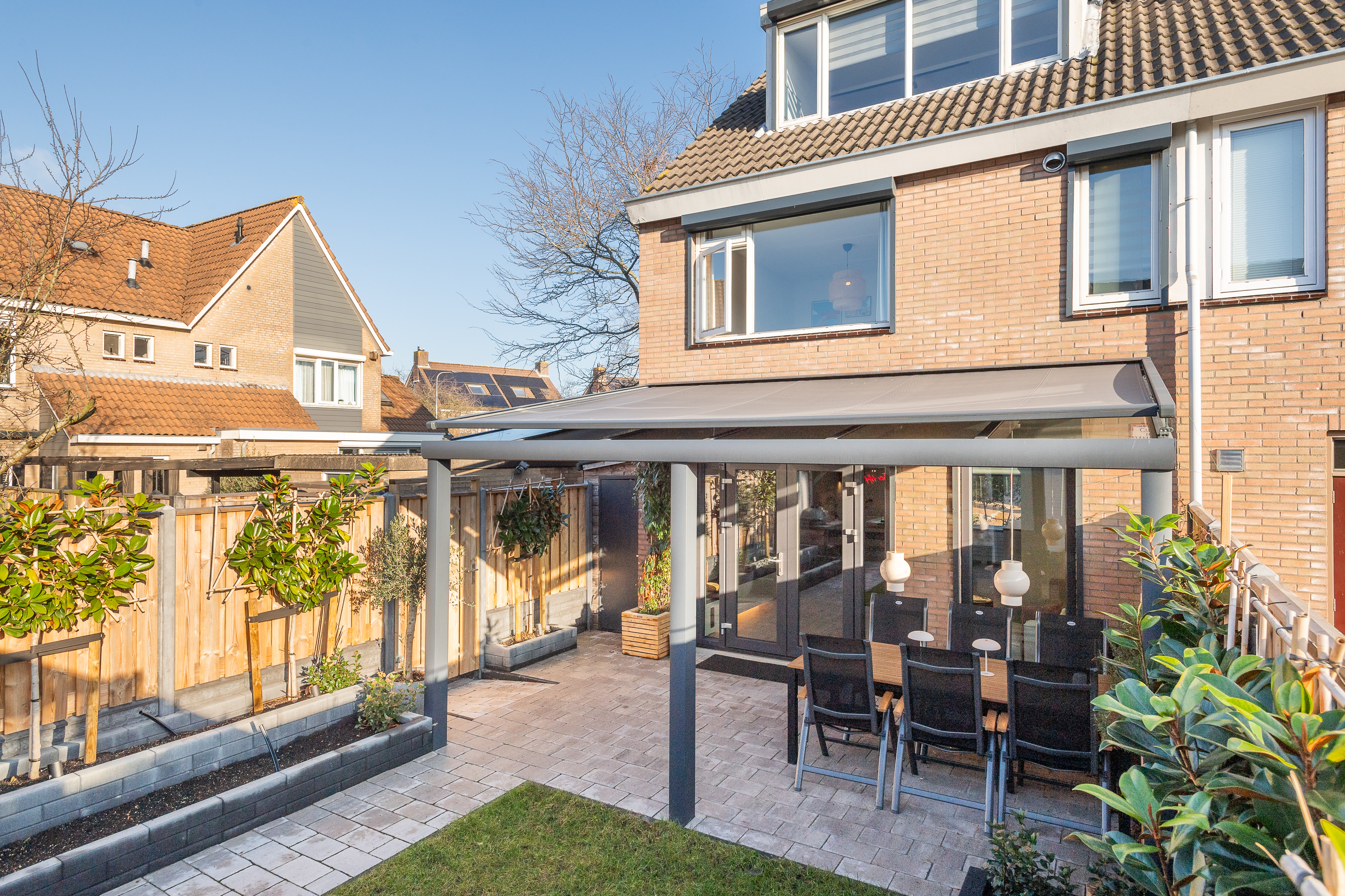 Glazen overkapping met zonwering aan de achtergevel.