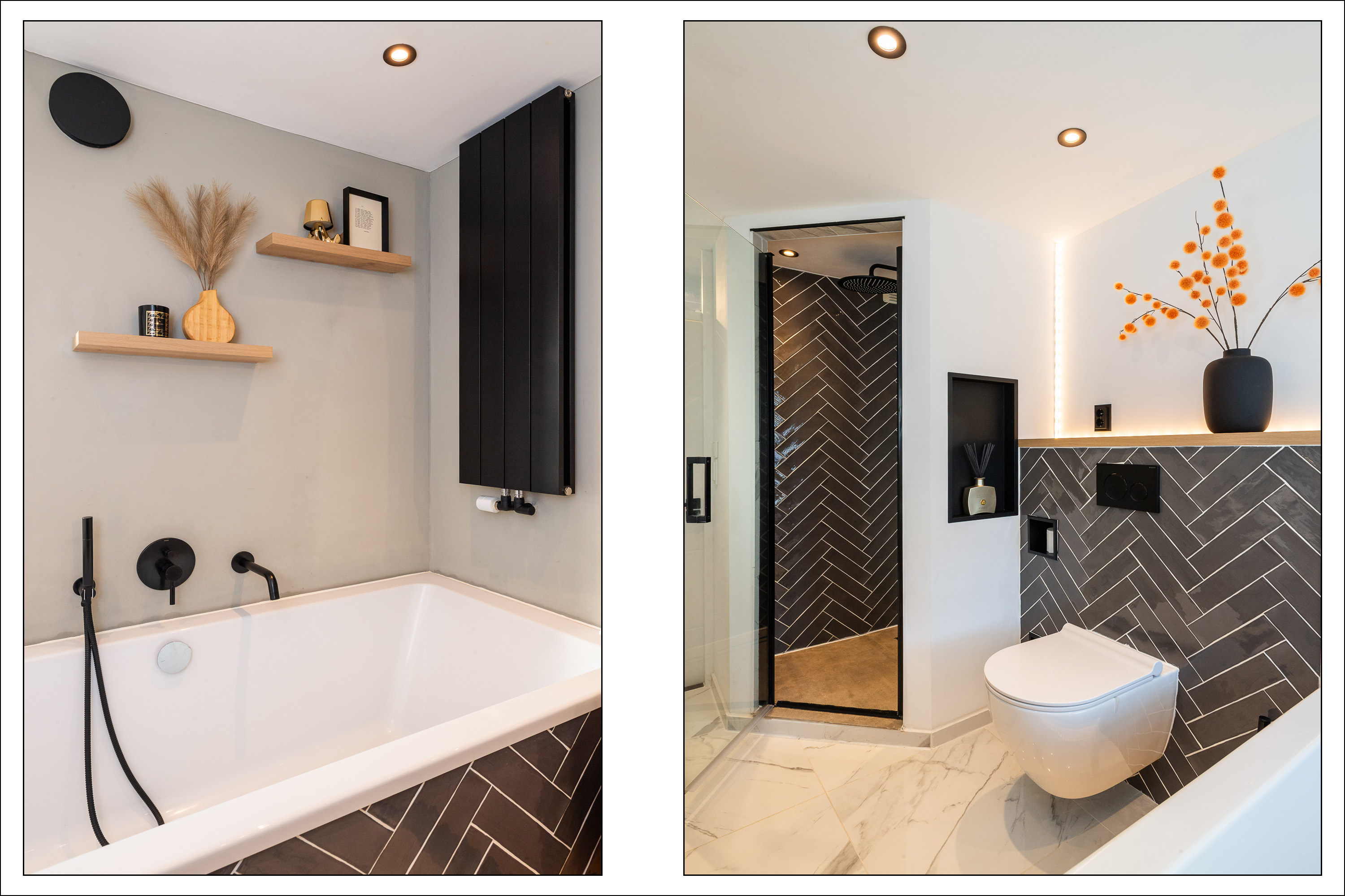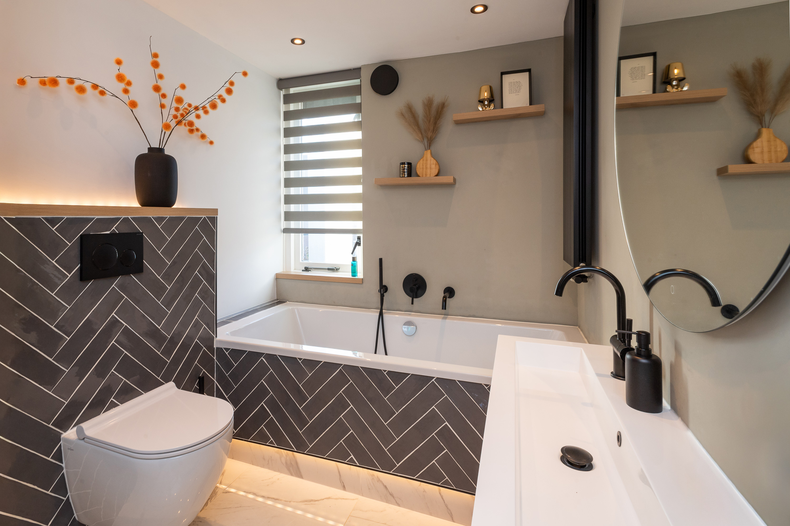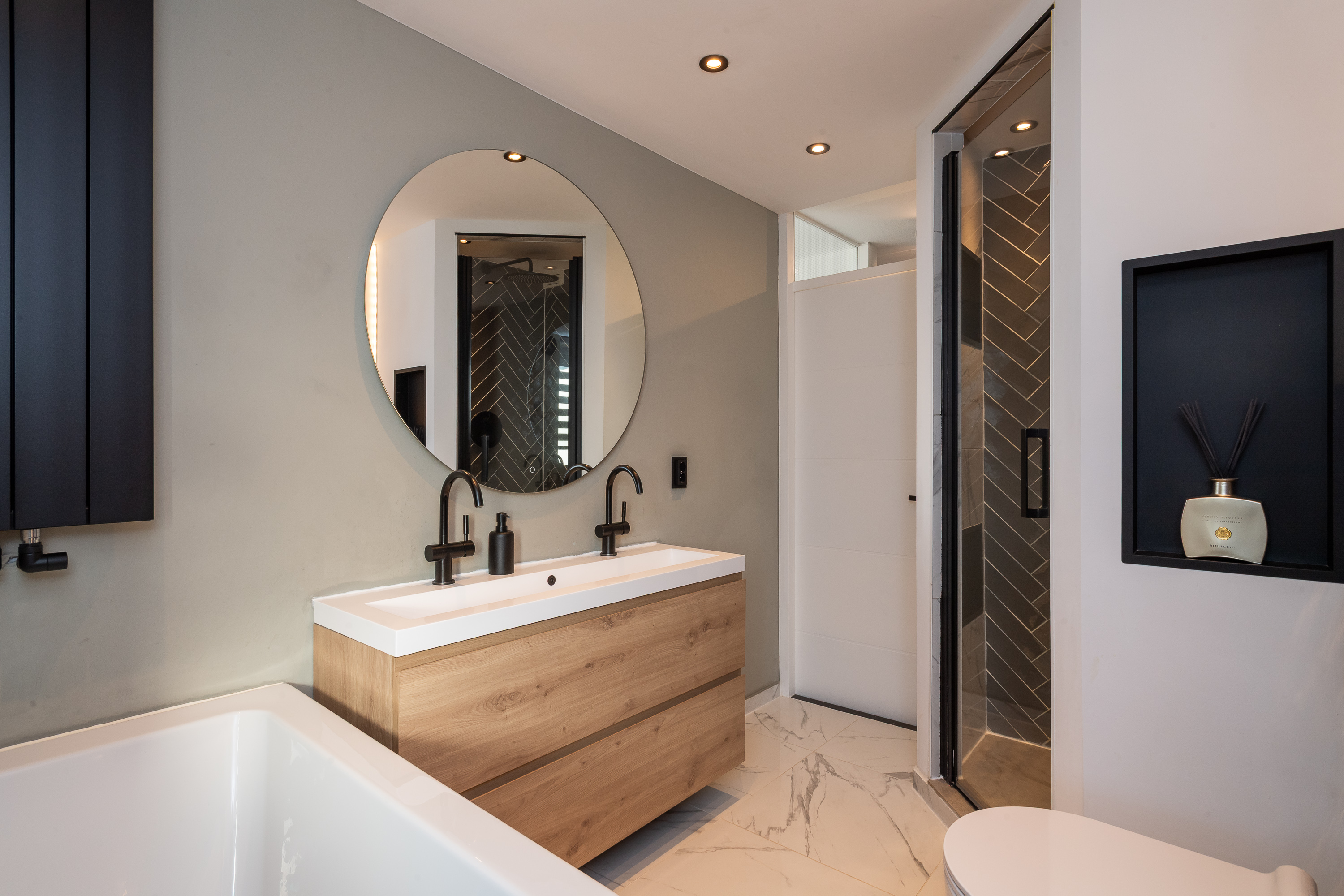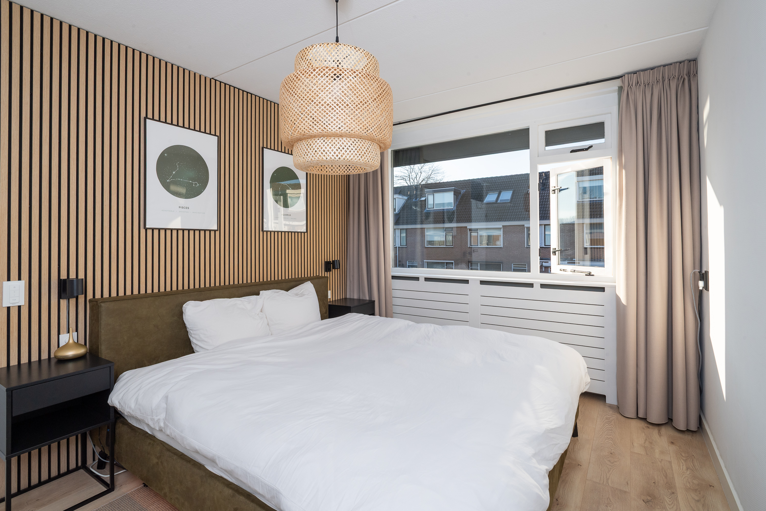 Overloop met trapopgang naar de tweede verdieping. De luxe badkamer (2023) gesitueerd aan de achterzijde, is afgewerkt met inbouwspots, gestuct plafond, visgraat-betegelde wanden en voorzien van een dubbele wastafel met wastafelmeubel met zwarte kranen en een grote ronde spiegel, 2e toilet, handdoekenradiator, ligbad met inbouwkraan en handdouche en een inloopdouche met inbouwkraan met regendouche en handdouche. Aan de achterzijde gelegen ouderslaapkamer met gestucte wandafwerking waarvan 1 wand met houten panelen, een laminaatvloer en radiatorbekleding. De 2e en 3e slaapkamer zijn gelegen aan de voorzijde en zijn voorzien van gestucte wandafwerking, laminaatvloer en radiatorbekleding.