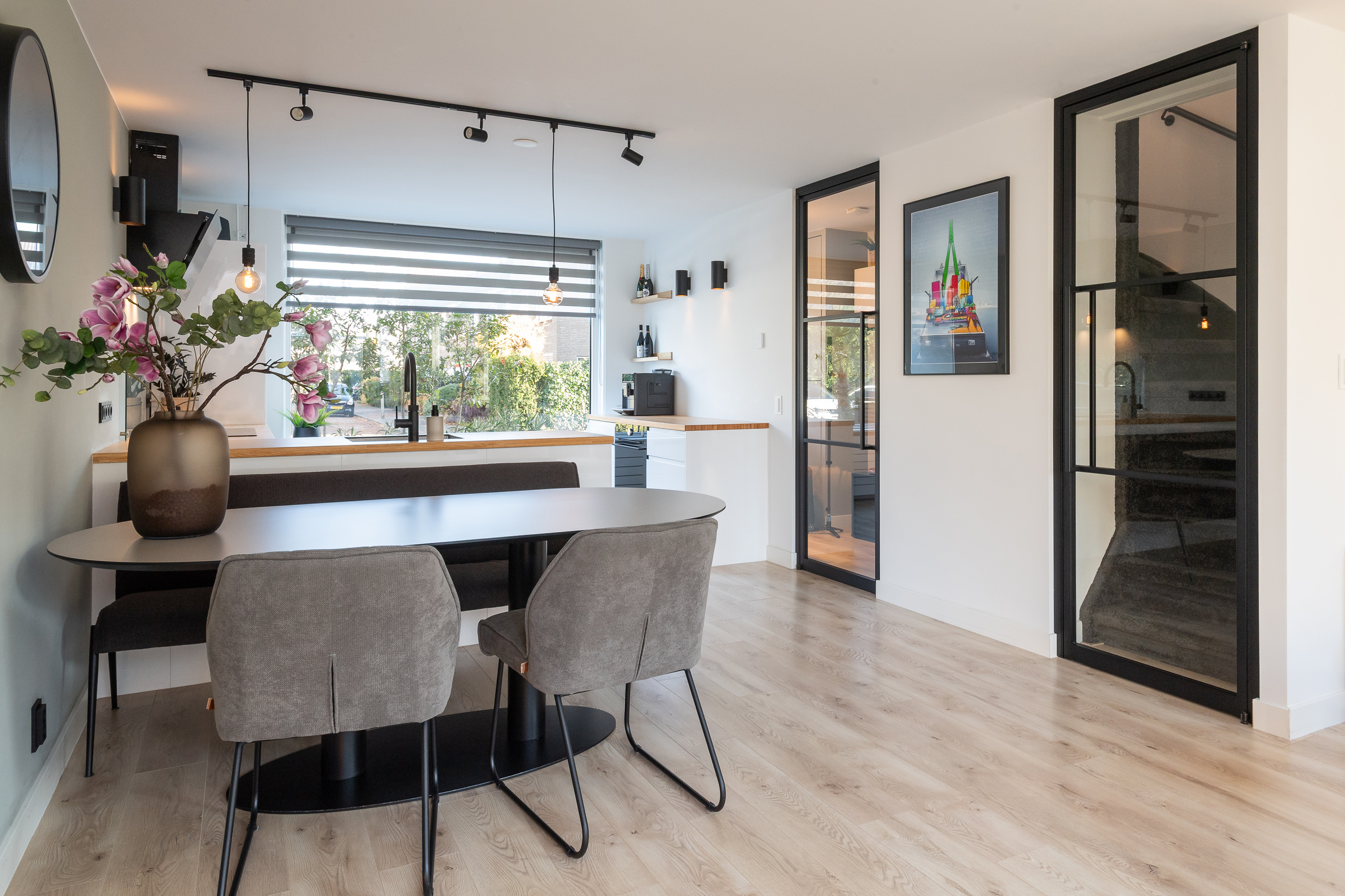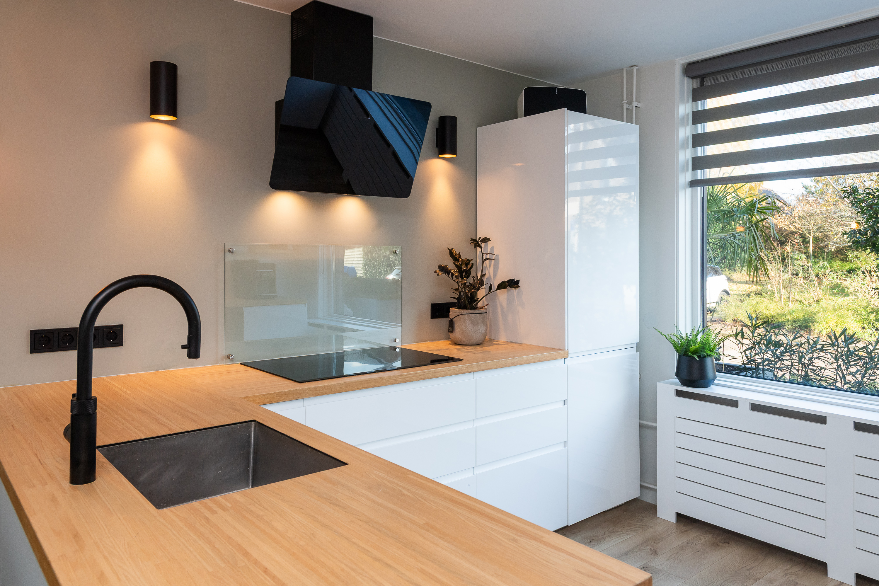 Entree met meterkast en toegang tot een luxe toiletruimte met fonteintje. Moderne, aluminium deur met glas (Gers) naar de woonkamer en keuken. De tuingerichte, zeer sfeervolle en lichte woonkamer is opnieuw ingedeeld en voorzien van met vaste nissen met inbouwspots, gestucte wanden- en plafond, radiatorbekleding, laminaatvloer en openslaande deuren naar de achtertuin met een ideale, glazen overkapping voorzien van een elektrisch bedienbare screen (op het glazen dak). De zonnige en mooi aangelegde achtertuin op het Westen is voorzien van hout-beton schuttingen, een stenen schuur met een aangrenzende houten overkapping met elektra, een schuur bereikbaar vanuit de tuin en een 3e schuur met toegang naar de zijkant. De luxe, moderne keuken (2022) is voorzien van een hoekopstelling, een extra keukenblok/unit en een speelse overloop naar de woonkamer. De keuken is voorzien van een uitgebreide inbouwapparatuur waaronder een Quooker, inductiekookplaat, afzuigkap (design) met motor en afvoer naar buiten, koelkast, vriezer, vaatwasser en een oven. Er zijn veel stopcontacten aanwezig. Middels een 2e fraaie, aluminium deur met glas (Gers) vanuit de woonkamer heeft u toegang tot de trapopgang naar de eerste verdieping.