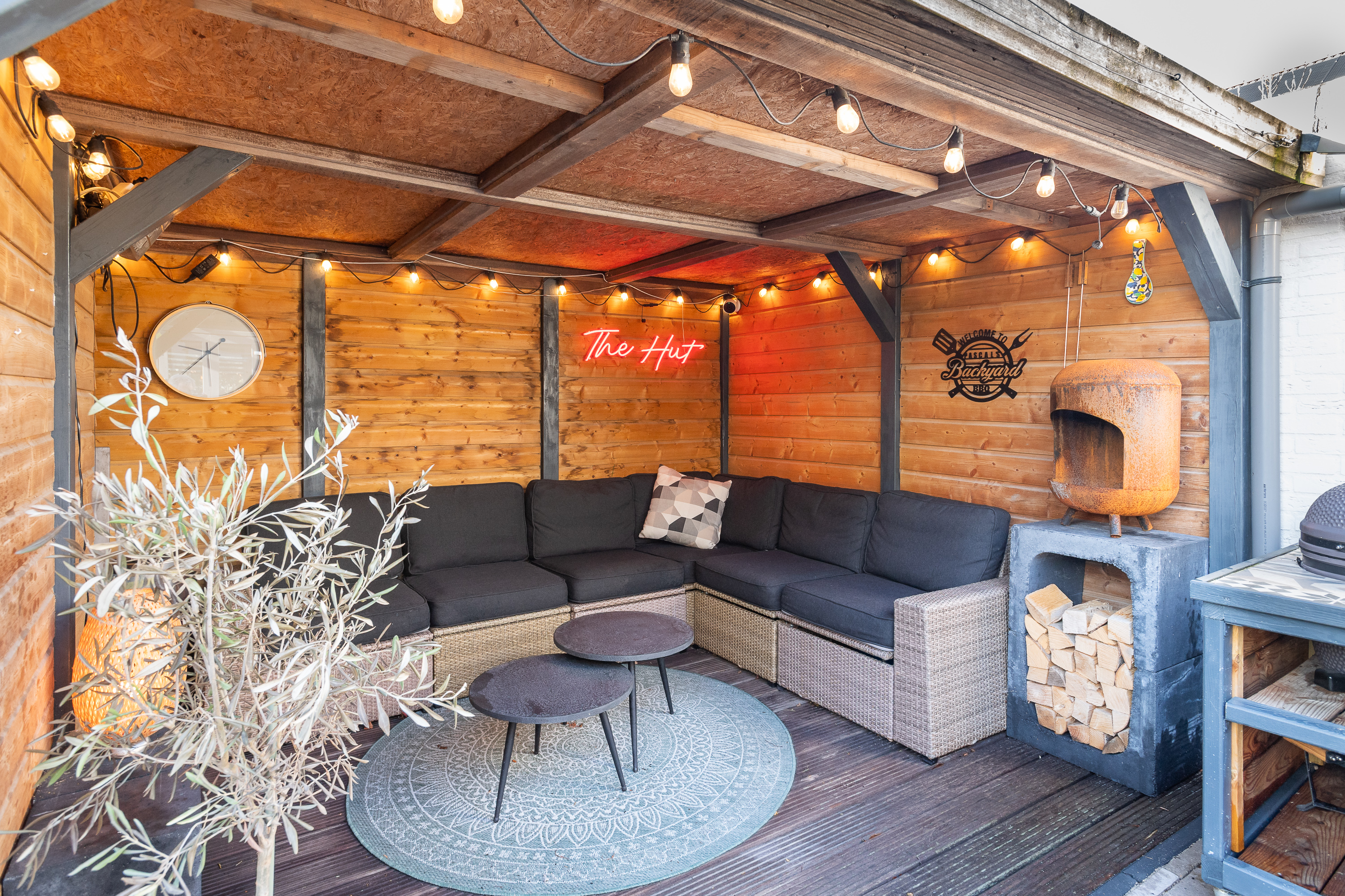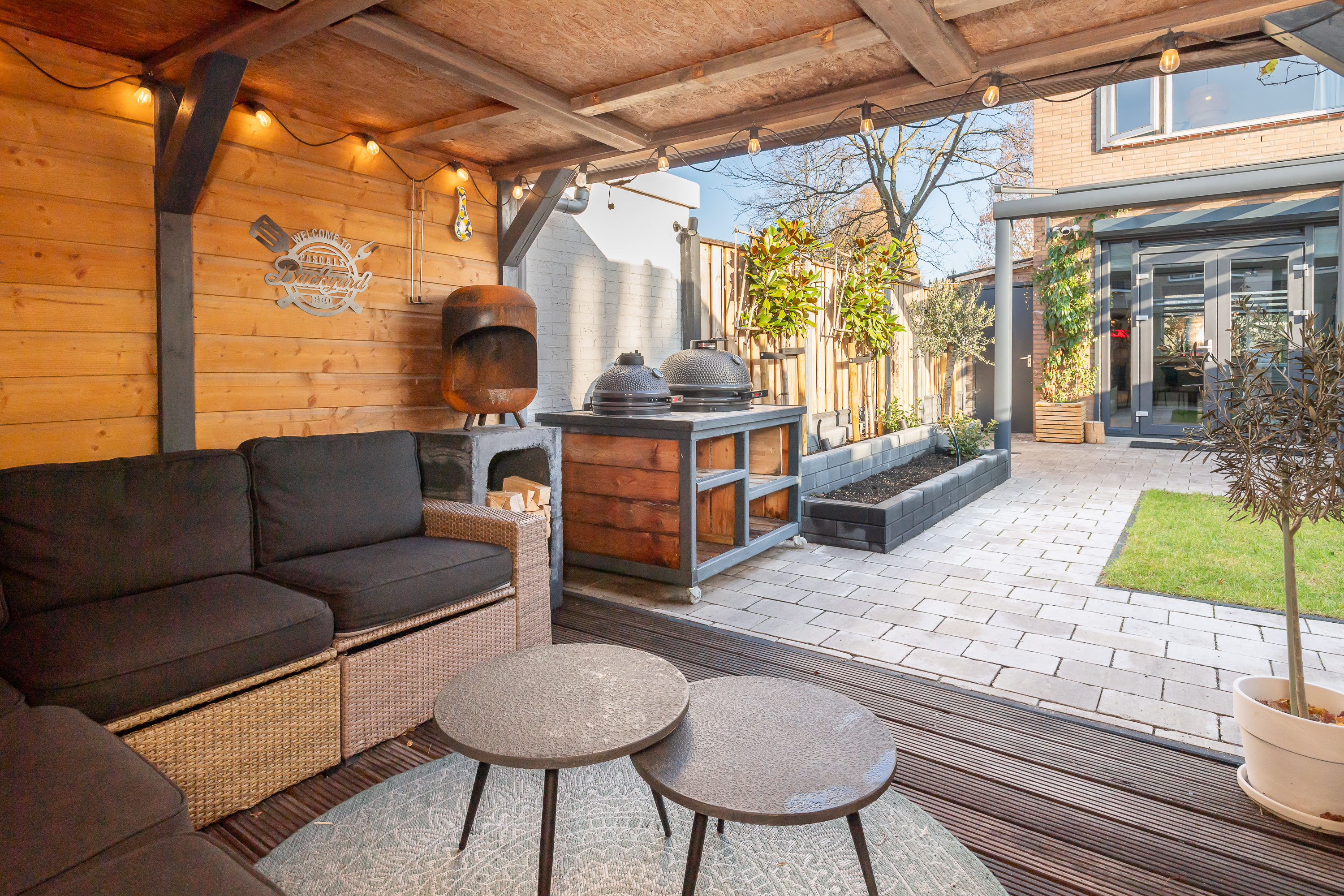 Houten overkapping met elektra in de achtertuin.