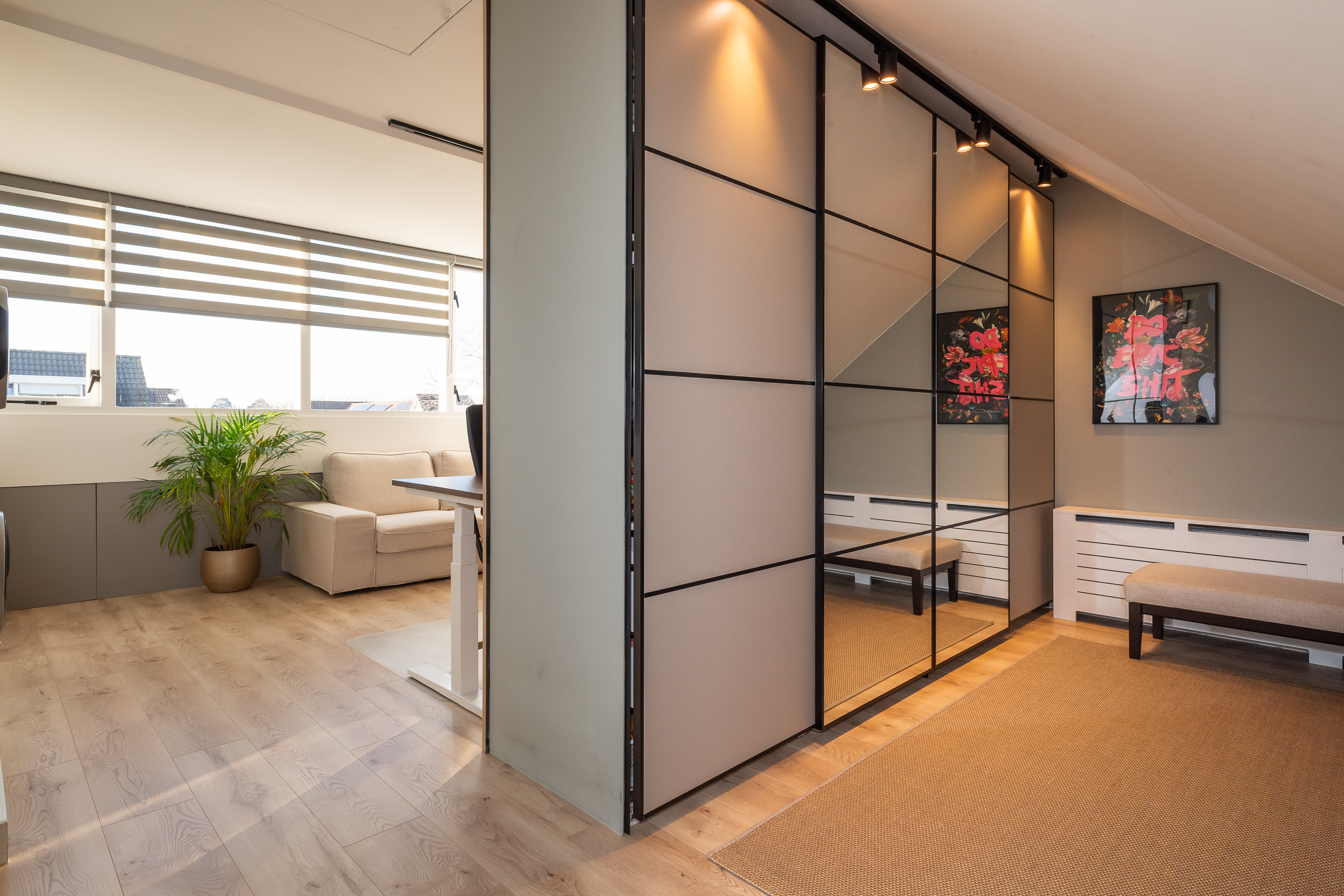 Riante zolderverdieping met dakkapel, een vlizotrap naar de bergvliering, bergruimte achter knieschotten, radiator met radiatorbekleding en de opstelplaats van de wasmachine en CV-combiketel. Inloop berging/kast met bergruimte achter knieschotten en radiator met radiatorbekleding. De zolderverdieping biedt de mogelijkheid tot het creëren van een 4e en 5e slaapkamer. De zolderverdieping is voorzien van een laminaatvloer en gestucte wanden waarvan 1 wand met houten panelen.