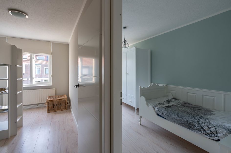 Overloop met toegang tot een separate was-/opbergruimte met CV-opstelling, dakraam, vaste opbergkasten achter de knieschotten en toegang tot een 4e slaap-/werkkamer aan de achterzijde met 2 dakramen en dito opbergruimte. Deze verdieping is eveneens voorzien van een laminaatvloer. Bergzolder over de gehele breedte van de woning.