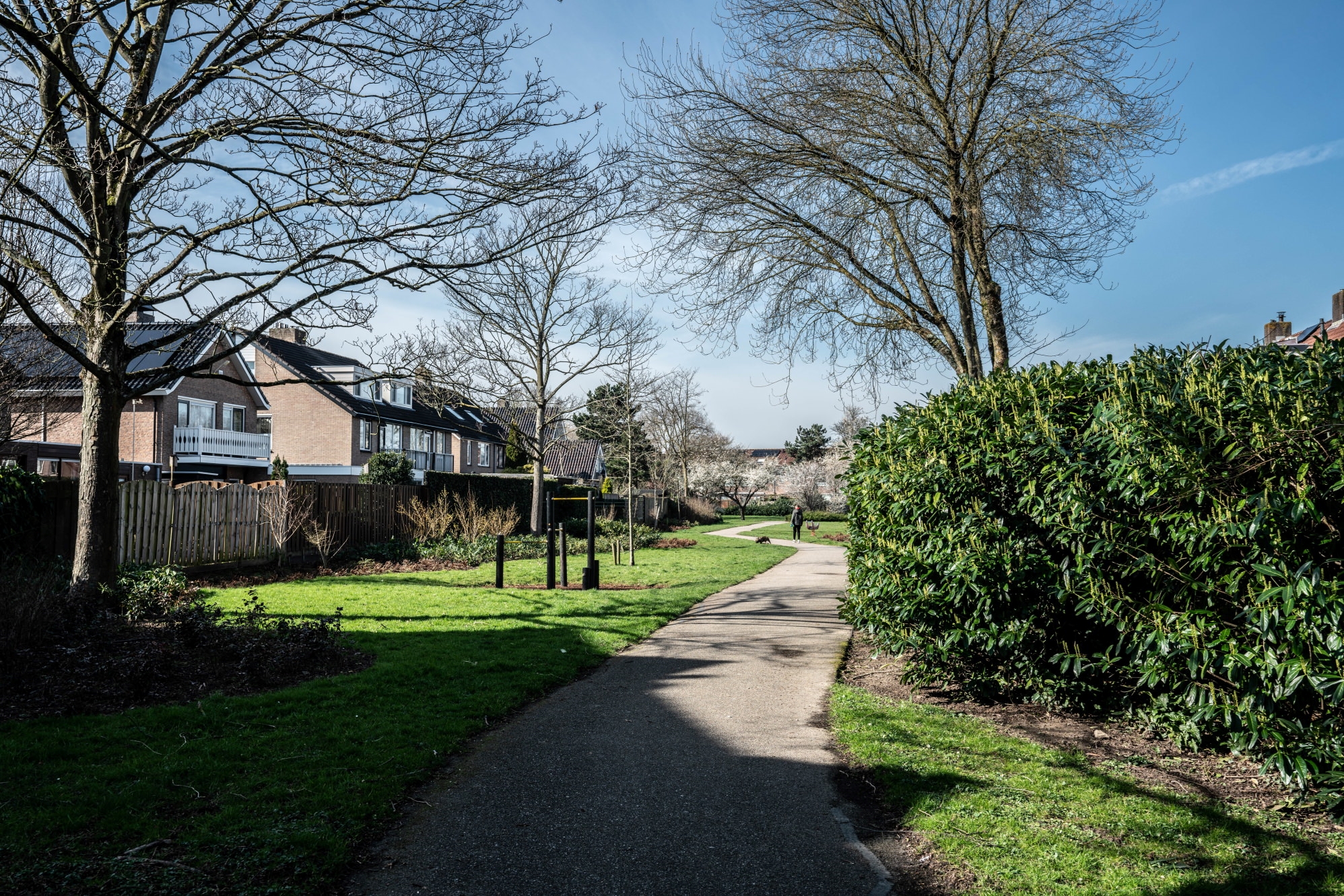Mooi aangelegde achtertuin met schuttingen, schuur en poort